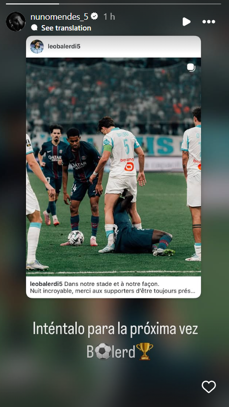 Nuno Mendes foi titular e foi um dos quatro que converteram os penáltis dos parisienses, ajudando a mais uma vitória. No final da partida, o internacional português recorreu às redes sociais para gozar com um adversário, Leonardo Balerdi. «Tenta de novo da próxima vez, Balerdi», escreveu, deixando os emojis do golo que marcou e do troféu que ganhou.