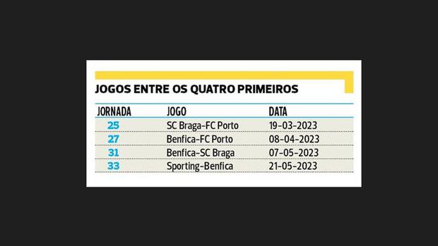 Faltam 12 jornadas para o final do Campeonato, mas nessa dúzia há quatro que são de particular interesse nas lutas pelo título nacional, pelo segundo lugar, que dá acesso direto aos grupos da Champions, e pelo terceiro, que permite disputar as pré-eliminatórias da Liga milionária. Referimo-nos às quatro rondas que colocarão frente a frente os quatro primeiros classificados e, neste capítulo, desde logo uma nota salta à vista: só o Benfica terá de jogar com os outros três, no que, teoricamente, se apresenta como o calendário mais difícil, embora sabendo que tem, hoje, oito pontos de vantagem sobre o segundo, o FC Porto (que visita Braga e Luz).
