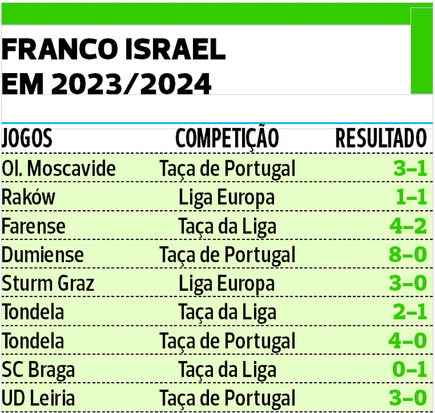 Estes números são já os melhores de sempre de Franco Israel desde que chegou a Alvalade no início da temporada 2022/2023 - foi contratado à Juventus, a troco de 1 milhão de euros. Nessa época de estreia de leão ao peito participou em oito jogos: dois na Liga dos Campeões - entrou aos 26’ em Marselha num jogo em que os leões foram goleados por 1-4 mas em que estiveram a vencer por 1-0, no entanto expulsão de Adán deitou tudo a perder; defrontou os franceses em Alvalade precisamente porque o espanhol teve de cumprir o jogo de castigo devido ao cartão vermelho em França -, um na Taça de Portugal, dois na Taça da Liga e três no campeonato, a substituir o espanhol devido a leão e castigo. Sofreu 11 golos. Agora na Taça de Portugal, é sempre Israel e mais 10.