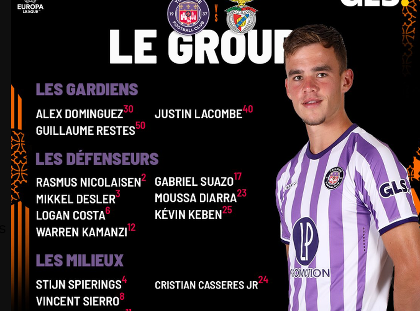 O Toulouse partilhou, esta quarta-feira, a lista de convocados para o jogo com o Benfica, referente à segunda mãos do play-off da Liga Europa.