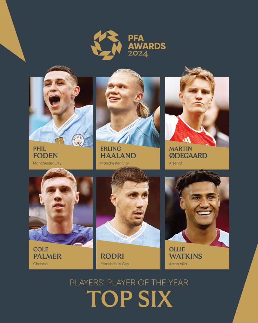 A Phil Foden, Erling Haaland (vencedor do ano passado) e Rodrigo juntam-se Martin Odegaard (Arsenal), Cole Palmer (Chelsea) - que acumula com nomeação para melhor Jovem - e Ollie Watkins (Aston Villa).