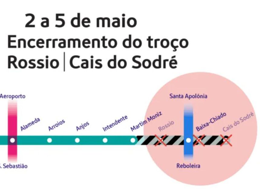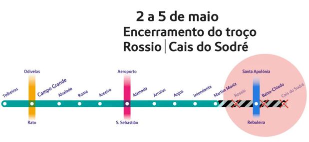 A circulação no troço entre o Rossio e o Cais do Sodré, da Linha Verde do Metropolitano de Lisboa, estará temporariamente suspensa entre os dias 2 e 5 de maio.