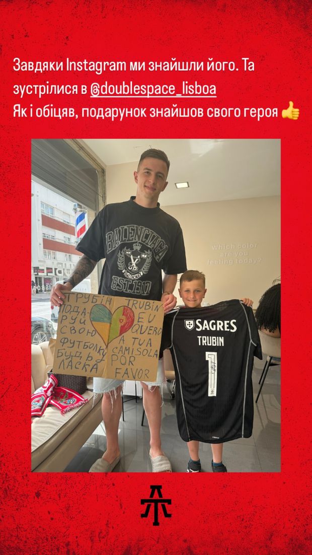 Acompanhada da fotografia do momento, Trubin escreveu uma pequena descrição: «Graças ao Instagram, encontrámo-lo! Como prometido, o presente encontrou o seu herói».
