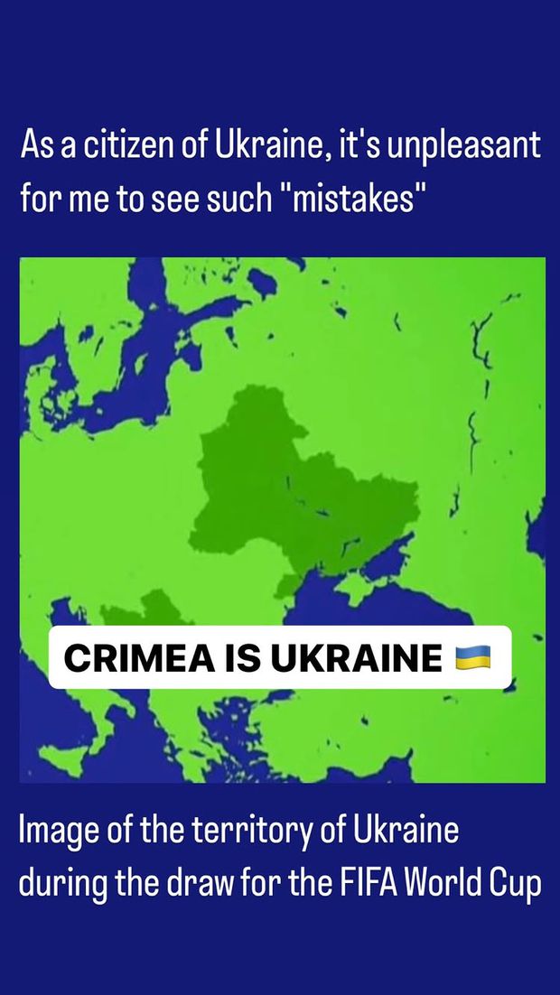 Na imagem, o território ucraniano apresentado não conta com a zona da Crimeia, o que levou o guardião benfiquista a revelar toda a indignação. «Enquanto cidadão da Ucrânia, é desagradável para mim ver estes 'erros' Crimeia é Ucrânia», diz, referindo-se à imagem mostrada no sorteio para o apuramento para o Campeonato do Mundo.