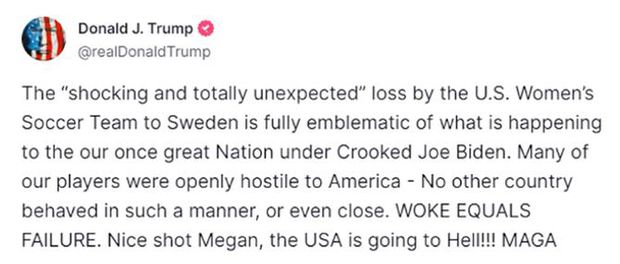«A 'chocante e totalmente inesperada' derrota da seleção feminina dos Estados Unidos contra a Suécia é totalmente demonstrativa daquilo que está a acontecer à nossa nação sob o comando do presidente corrupto Joe Biden. Muitas das nossas jogadoras mostraram-se hostis relativamente ao nosso país. Nenhum outro país se comportou dessa maneira. 'Woke' equivale a falhanço. Bom remate, Megan! Os Estados Unidos vão para o inferno», atirou, na rede social Truth.