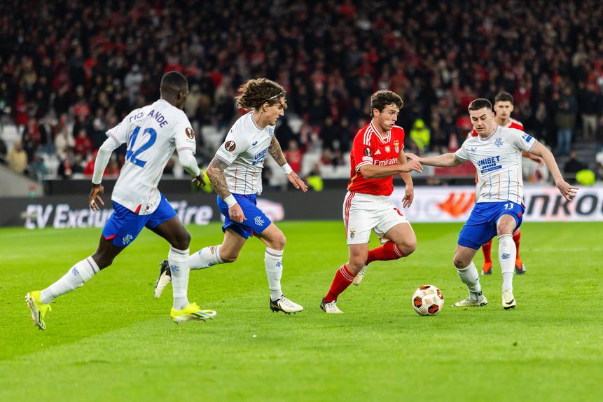 O Benfica jogou em 4x2x3x1, tal como o Rangers, com as equipas a encaixarem-se mutuamente. Os encarnados entraram bem, mas os escoceses, na primeira vez que entraram no ultimo terço dos encarnados, fizeram golo. Mais um cruzamento do lado direito da defesa encarnada com o Rangers a inaugurar o marcador. O Benfica tremeu um pouco porque o Rangers teve sempre a baliza encarnada na mira. A equipa de Schmidt demorou a entrar no sistema tático do Rangers e só aos 14 minutos criou uma oportunidade desperdiçada por Arthur Cabral. A partir daí o Benfica cresceu muito por força de João Neves e pela capacidade de penetração de Neres pelo lado esquerdo e Di María mais da direita para dentro. O Benfica apertou o adversário e teve a grande penalidade merecida, com o golo do empate em cima do intervalo. Pensava-se que esse seria o resultado ao intervalo e com o Benfica por cima mas mais uma vez Fábio Silva com um cruzamento com Sterling no coração da área encarnada a fazer o segundo golo.