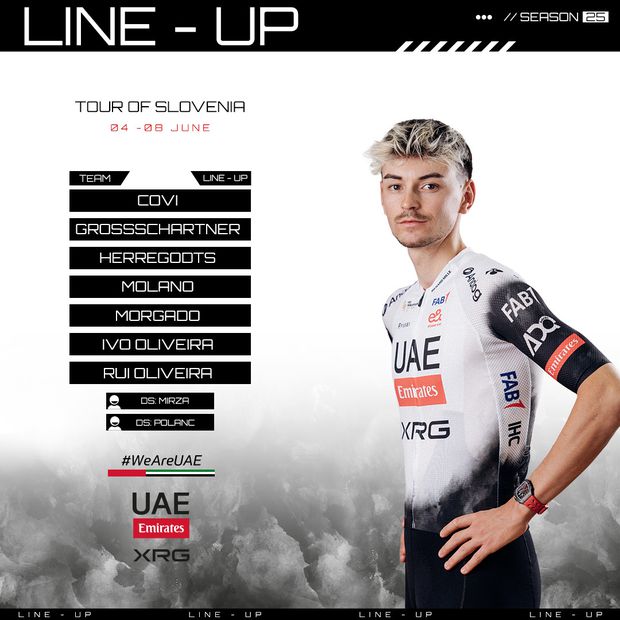 O Tour da Eslovénia começa já esta quarta-feira - e termina no domingo -, e a equipa UAE Emirates-XRG revelou o conjunto de ciclistas que vão competir na prova, sendo que antes já contaram com nomes como Diego Ulissi e Tadej Pogacar, vencedores em 2019, e 2021 e 2022, respetivamente.