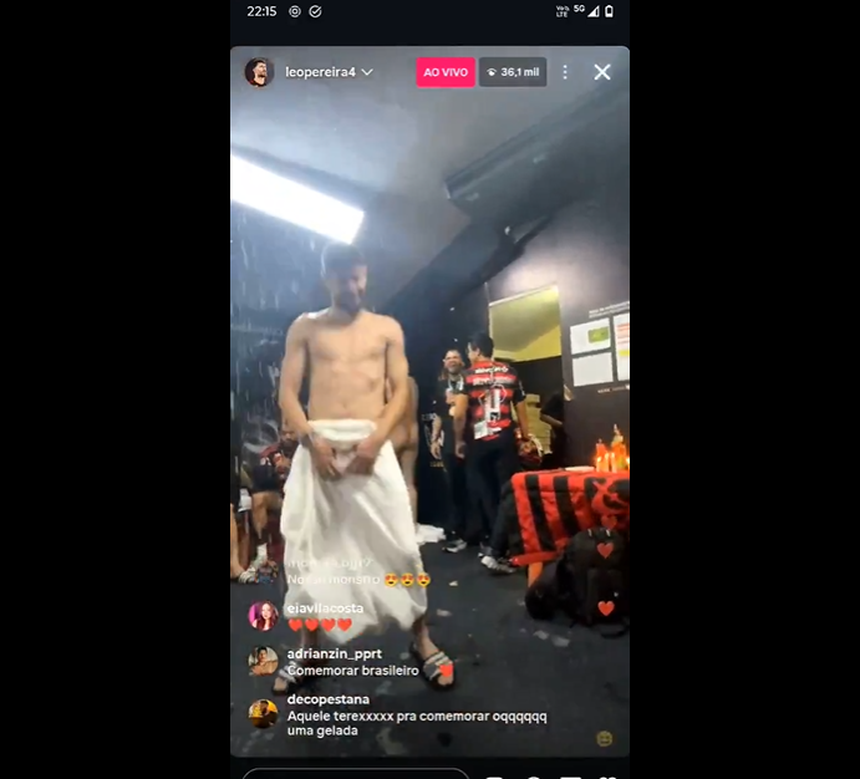 Na festa no balneário depois do triunfo sobre o Palmeiras, de Abel, Léo Pereira decidiu fazer um direto no Instagram e estava a filmar Jorginho a ser encharcado. O problema é que ao fundo estava Saúl nos preparativos para o banho, totalmente nu.