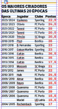 Destaque ainda para o 5.º lugar do jovem Geovany Quenda logo seguido por Nico González, num grande desempenho (e se calhar pouco enfatizado) do médio portista só presente em 18 jornadas ao partir em janeiro para o Manchester City.