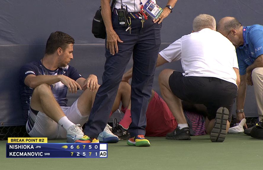 No início do quinto set, frente ao sérvio Miomir Kecmanovic, o japonês sucumbiu ao muito calor e à humidade que se faz sentir em Nova Iorque. Momentos antes tinha sentido cãibras e tonturas.