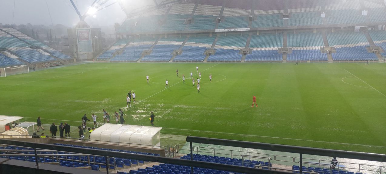 Debaixo de um grande temporal que afetou a 1ª parte e obrigou o árbitro Tiago Martins a interromper o jogo – os jogadores estiveram nos balneários cerca de 40 minutos – o V. Guimarães não teve dificuldade em bater o Moncarapachense, com uma entrada forte e aproveitando o forte vento que soprou no Estádio Algarve. Chegou rapidamente a uma vantagem de três golos, por Tomás Ribeiro, que finalizou sobre a linha de golo, Jorge Fernandes, que penteou a bola num livre de Tomás Hendel e num remate à meia volta de Jota Silva no interior da área, num golo que evidenciou as condicionantes do tempo: Igor bateu um pontapé de baliza, a bola voltou para trás entre o meio-campo e área algarvia para ficar na posse dos vimaranenses, que finalizaram na sequência da jogada. Além do maior poderio dos minhotos, os algarvios ainda tinham que enfrentar a forte ventania que soprava contra.