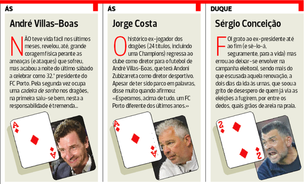 Para já, há três questões em cima da mesa do novo presidente, que requerem urgência máxima e têm a ver com ações de última hora do seu principal opositor: a venda dos direitos comerciais por período alargadíssimo; o Centro de Estágio da Maia; e a renovação, por mais quatro épocas, com Sérgio Conceição. Qualquer delas, estruturante, representa um teste à fortaleza de convicções de André Villas-Boas. Mas, não menos relevante, será a forma como o presidente-eleito irá relacionar-se com os Super Dragões, depois de tudo o que aconteceu.