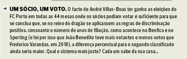 Frederico Varandas, numa circunstância comparável (pelo menos em animosidade, dizendo o menos), soube ser determinado e coerente, e com isso só fortaleceu a sua presidência. Porque, no fim do dia, o criador acaba por ficar, inevitavelmente, refém da criatura. Esta é, pois, uma oportunidade única para Villas-Boas impor as regras do jogo, estabelecendo uma cerca sanitária que o preserve da promiscuidade. Mas haverá outras tarefas, quiçá menos mediáticas, que serão determinantes para o rumo do clube. O FC Porto precisa de se abrir ao mundo, fazendo do regionalismo que lhe está no ADN uma bandeira que não sirva só para agredir, e passe a ser inclusiva.