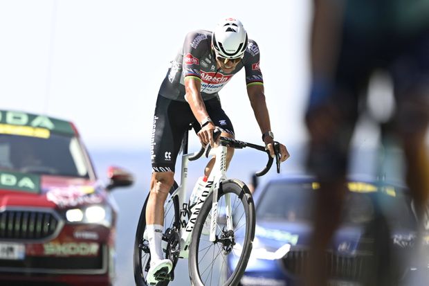 O corredor da equipa Alpecin acusou a fadiga de um loga e exigente jornada e cruzou a meta exausto, a contar todos os segundos para a chegada de Pogacar.