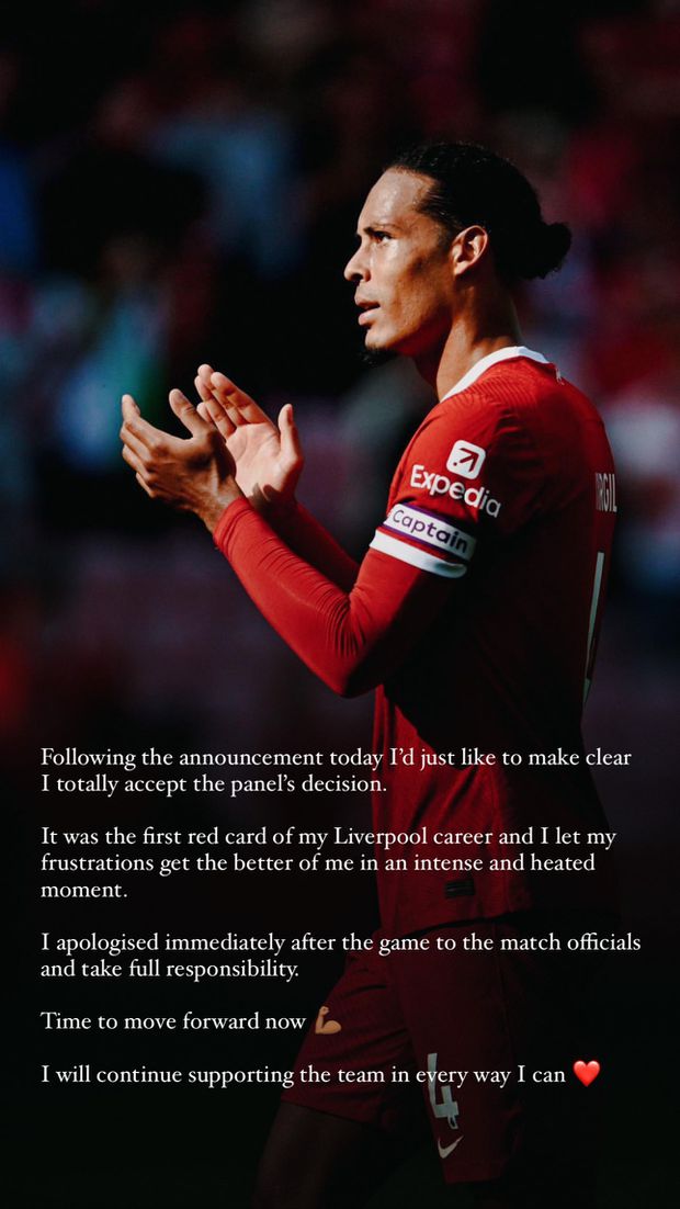 «Depois do anúncio de hoje, queria deixar claro que aceito totalmente a decisão tomada. Foi o meu primeiro vermelho no Liverpool e deixei que as frustrações tomassem conta de mim num momento intenso», começou por escrever, nas histórias do Instagram.