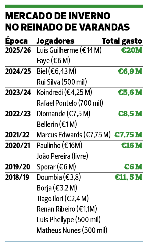 Número redondo numa janela de mercado que implicou forte investimento. Bem distante de todos os outros da era de Frederico Varandas em Alvalade. Só equiparado, olhando para o passado recente, com o montante gasto em 2020/2021 e que terminou com a conquista do... título. Ruben Amorim, técnico na altura, centrou todas as atenções na contratação de Paulinho, avançado já experiente que despontava no SC Braga, no qual o Sporting teve de investir €16 milhões, tornando-se, até essa altura, convém lembrar, no avançado mais caro da história do clube leonino.