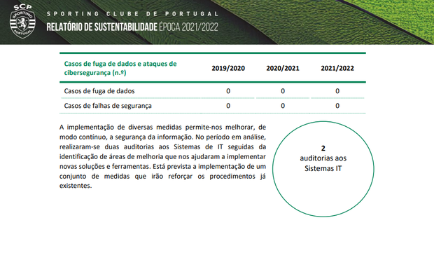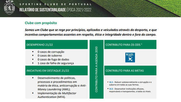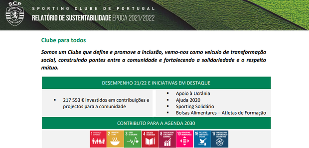 O Sporting publicou, esta terça-feira, o seu Relatório de Sustentabilidade da época 2021/2022, realçando a sustentabilidade como parte integrante do seu ADN, reforçando o compromisso com a transparência e promoção de práticas comerciais que visem a longevidade, prosperidade da própria organização, em simultâneo com impacto positivo na sociedade e meio ambiente.
