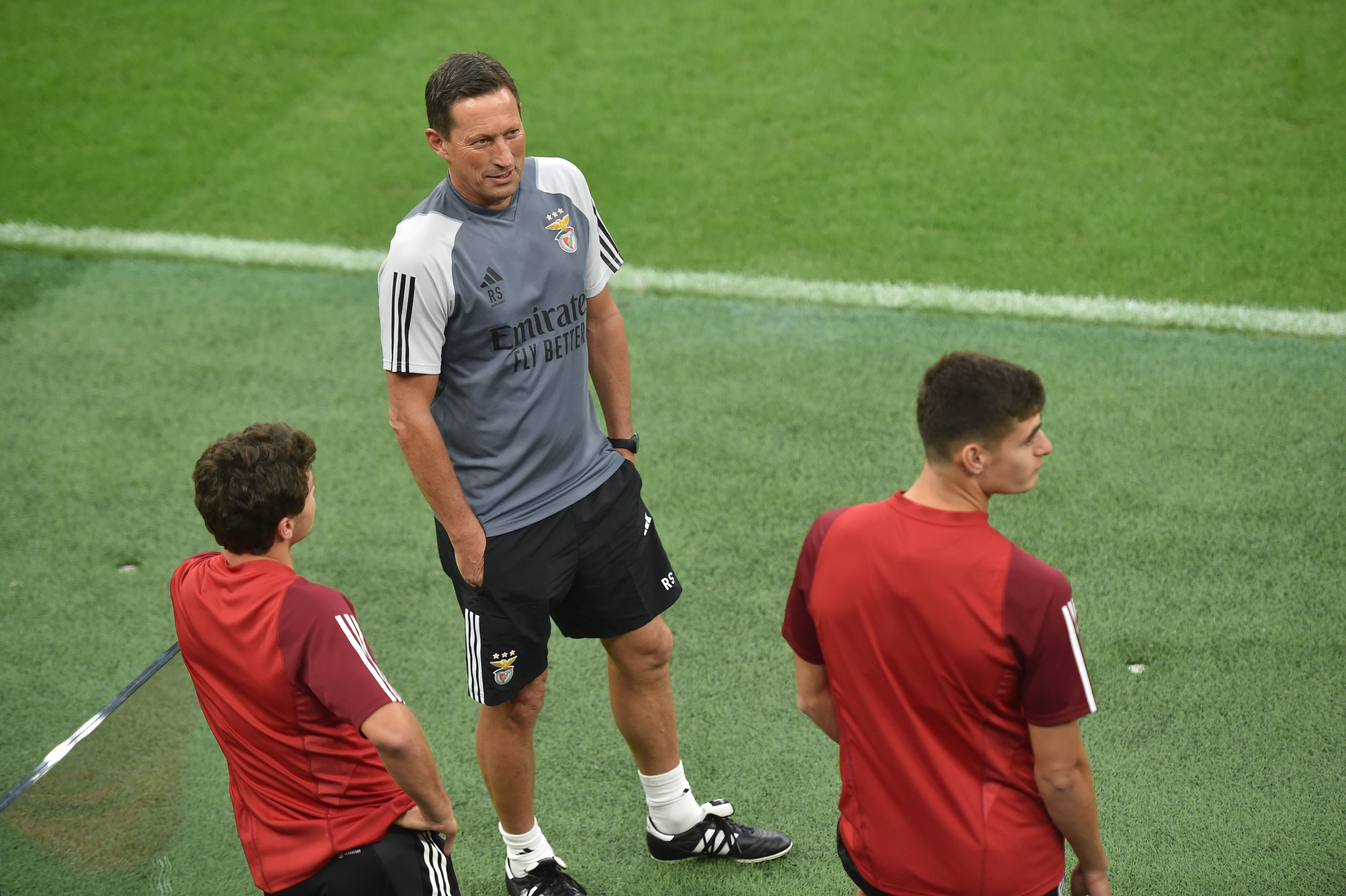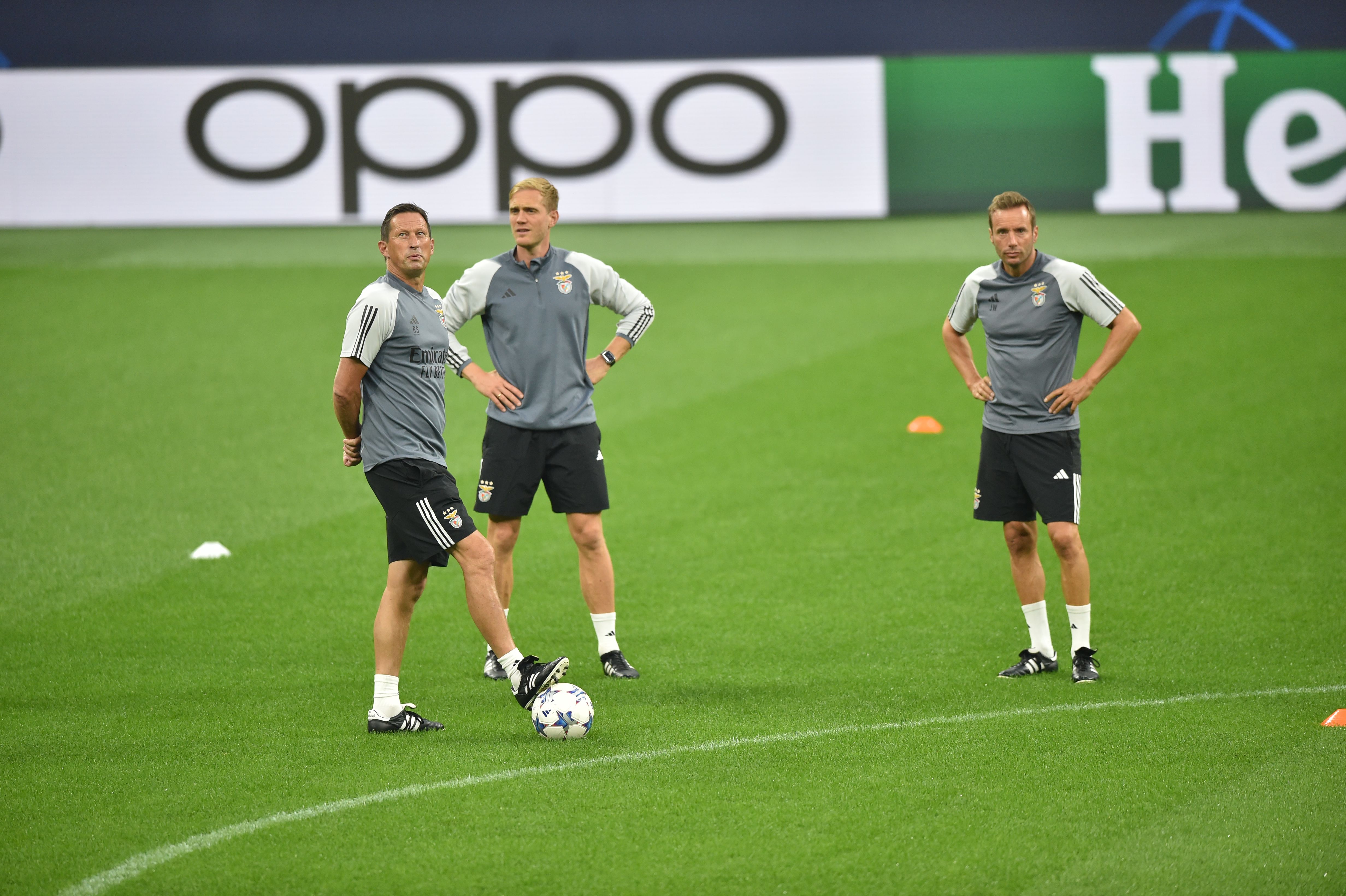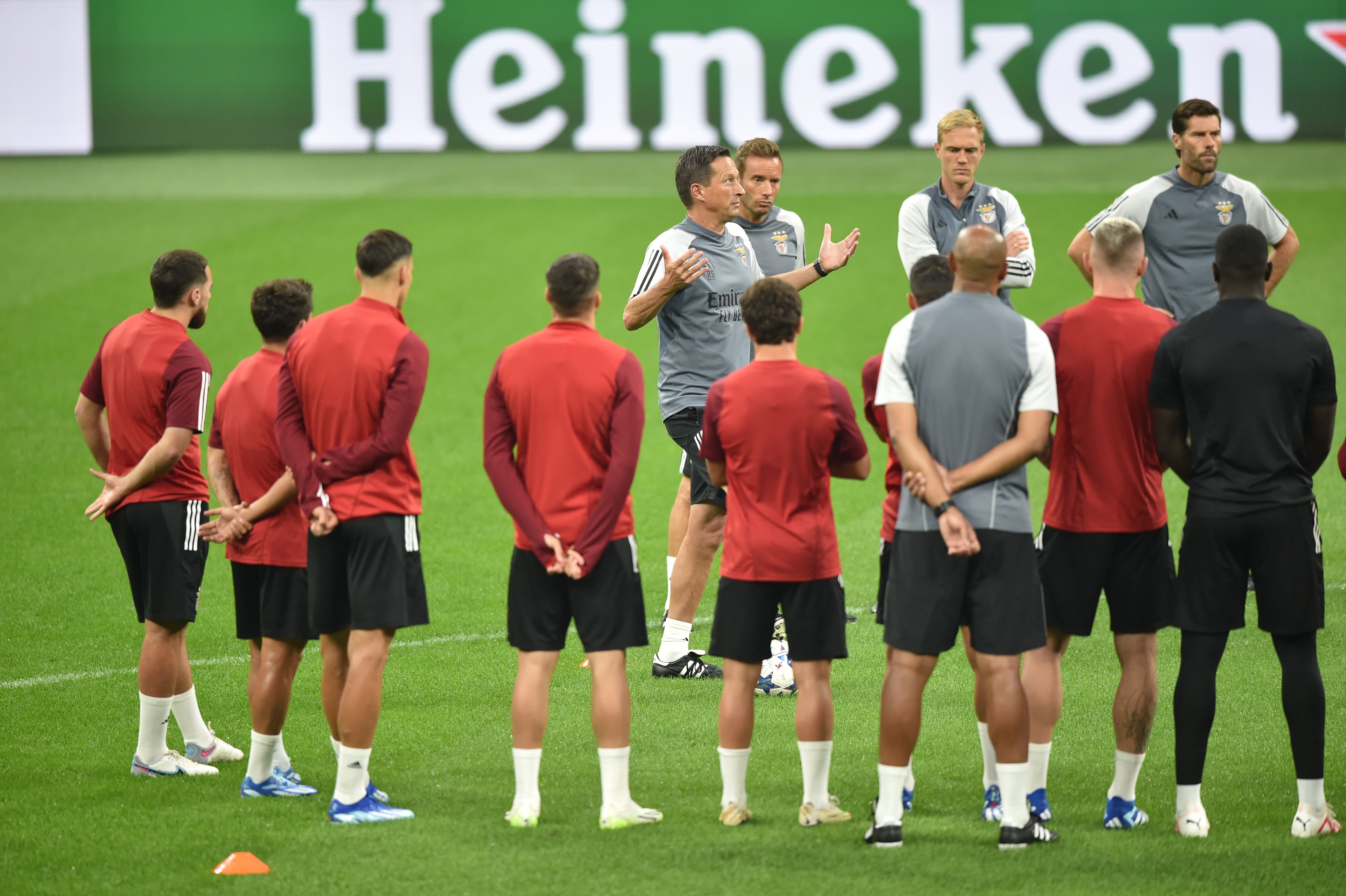 Os primeiros 15 minutos decorreram com a presença da comunicação social e no relvado evoluíram todos os jogadores que Schmidt trouxe para Itália, incluindo o extremo Gonçalo Guedes e o lateral-esquerdo Juan Bernat, que recuperaram de lesões e foram as duas surpresas na lista de convocados do treinador alemão que comanda os encarnados. António Silva, central que foi expulso na 1.ª jornada, frente ao Salzburgo, não pode defrontar o Inter, mas também viajou para Itália e esteve no relvado com o grupo.