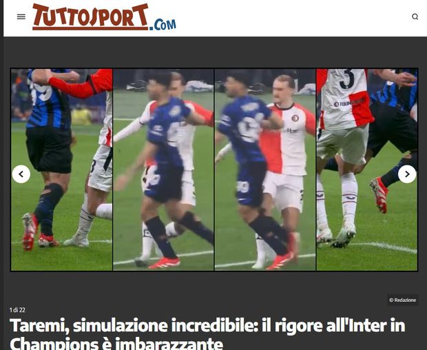 Contudo, o Tuttosport não concorda com a decisão do árbitro e não poupou nas palavras: «Taremi, simulação incrível: pénalti vergonhoso para o Inter.»