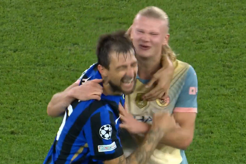 Erling Haaland e Francesco Acerbi mediram forças no Manchester City-Inter, da Liga dos Campeões, que terminou empatado a zeros, e no final do encontro protagonizaram momento hilariante.