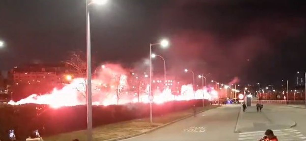 Milhares de adeptos do Atlético Madrid aguardaram pela chegada do autocarro com a equipa colchonera e iluminaram as ruas com um fantástico espetáculo pirotécnico, em jeito de aquecimento para o grande jogo que já se iniciou.