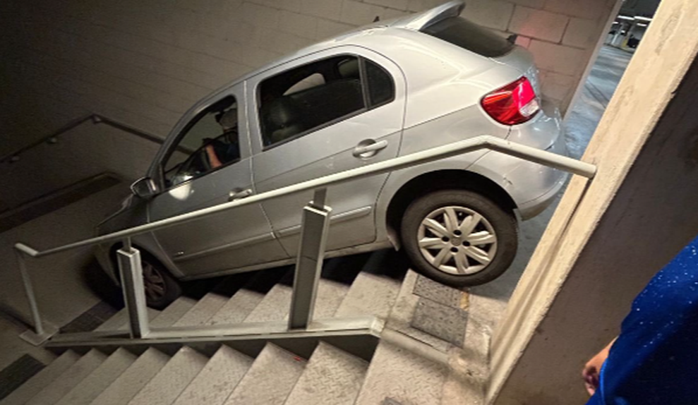 Uma hora depois do incidente, os bombeiros chegaram ao local e conseguiram retirar o carro das escadas. Não houve feridos.