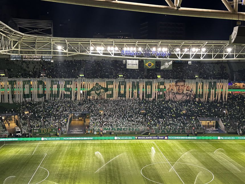 No início do jogo entre o Palmeiras e o América Mineiro, que resultou na vitória do verdão, por 4-0, os adeptos do Palmeiras homenagearam Abel Ferreira, treinador do clube brasileiro, com um espectáculo brilhante.