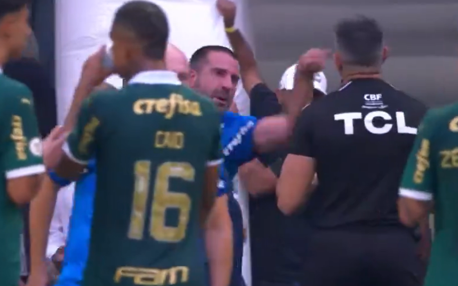 João Martins, adjunto de Abel Ferreira no Palmeiras, foi expulso, na compensação da primeira parte, e partiu para cima do árbitro Raphael Claus.
