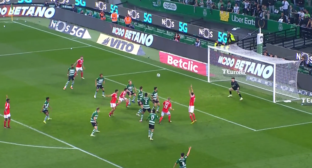 Os jogadores do Benfica ficaram a pedir penálti, aos 39 minutos, por eventual braço na bola de Gonçalo Inácio, após remate de Florentino.