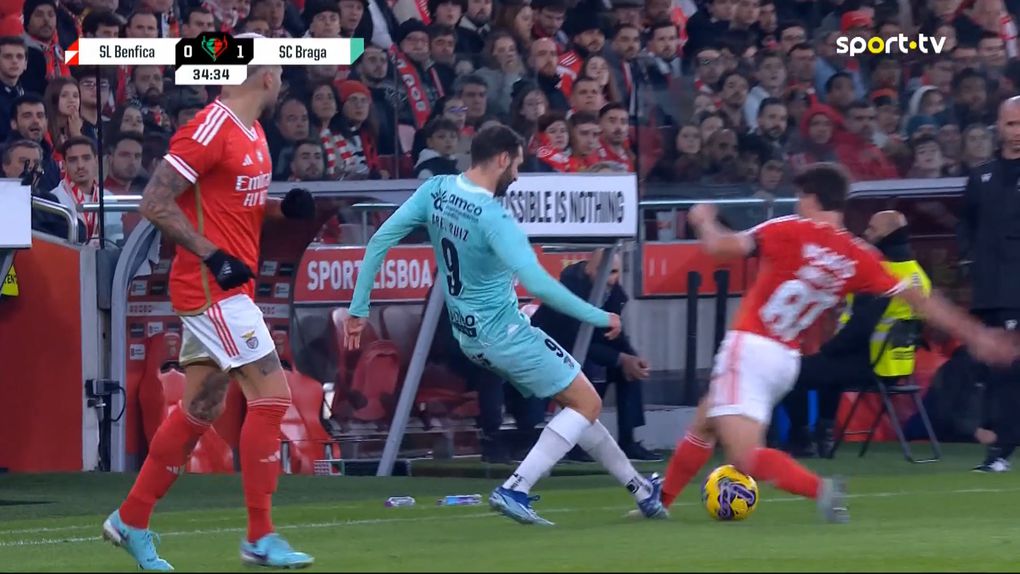 Os jogadores do Benfica pediram cartão vermelho para Abel Ruiz, depois de o avançado do SC Braga ter pisado o tornozelo de João Neves. O avançado espanhol não viu o cartão e, inclusivamente, a falta foi marcada por Nuno Almeida contra os encarnados.