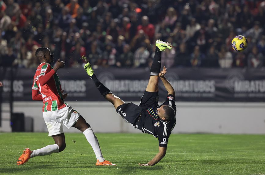 Arthur Cabral, aos 44 minutos, após passe de Di María, mata com o peito e remata de bicicleta para o primeiro golo do Benfica na Reboleira.