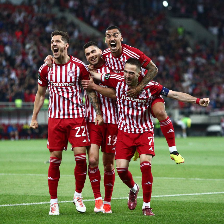 Chiquinho a celebrar o golo com os seus colegas de equipa (@olympiacosfc)