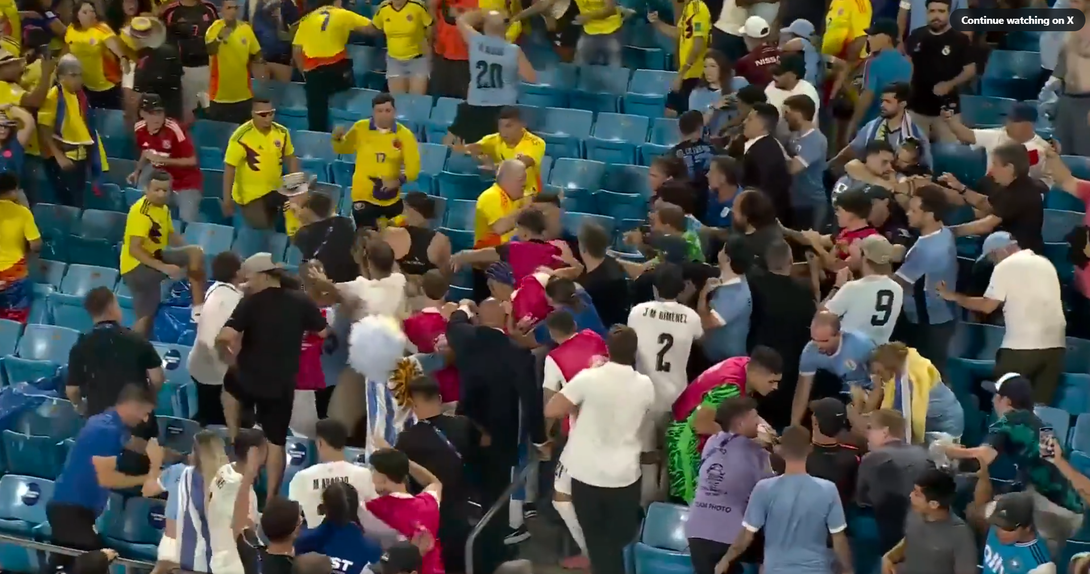 Cenas de loucura após o apito final no Colômbia-Uruguai, das meias-finais da Copa América. Após a confirmação do triunfo cafetero, vários jogadores da Celeste Olímpica, com Ronald Araújo - que não participou na partida devido a lesão - e o ex-benfiquista Darwin Núñez à cabeça, invadiram as bancadas do estádio do Bank of America Stadium e entraram em confronto com os adeptos colombianos. O ponta de lança disferiu mesmo alguns socos, como se pode ver nas imagens abaixo.