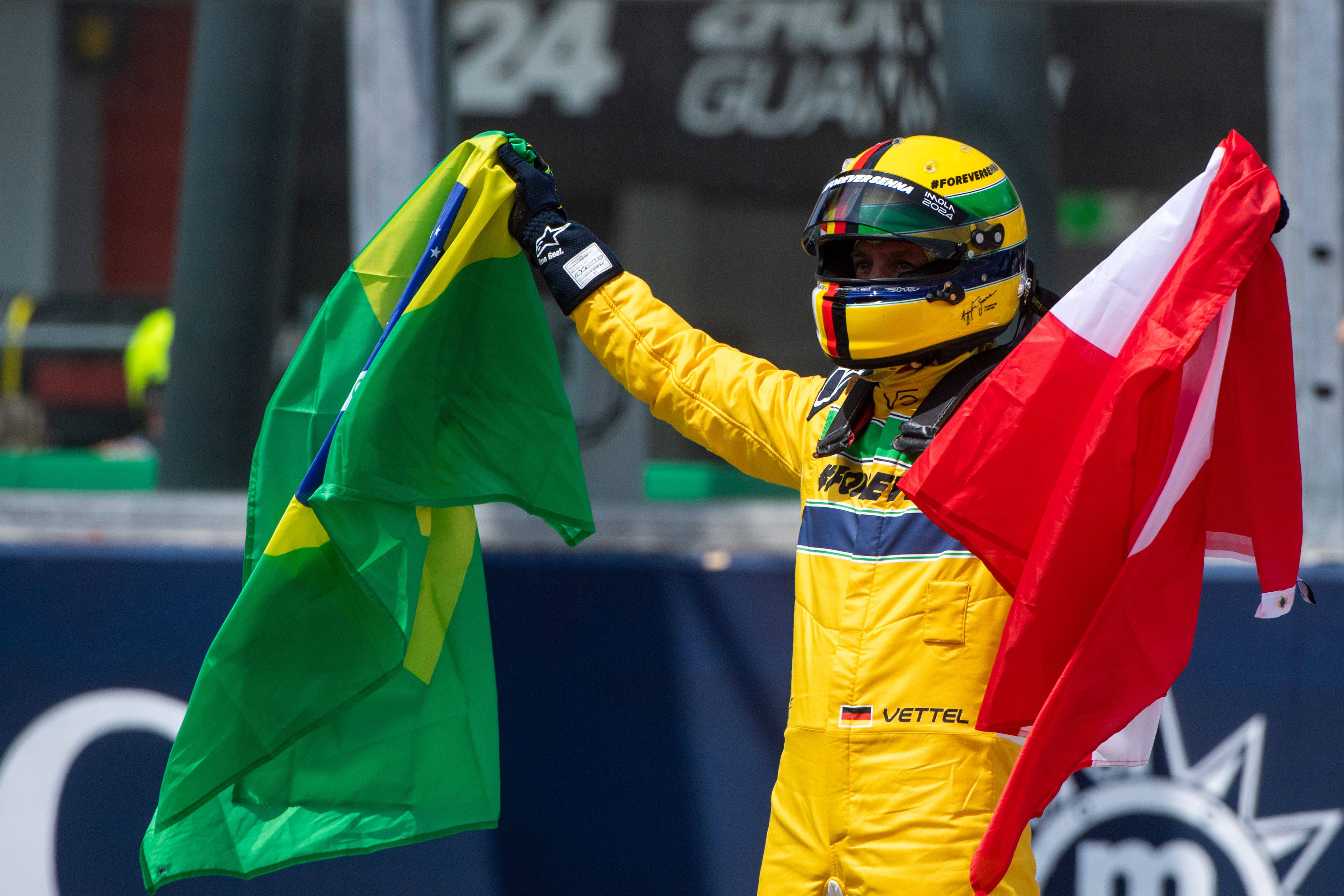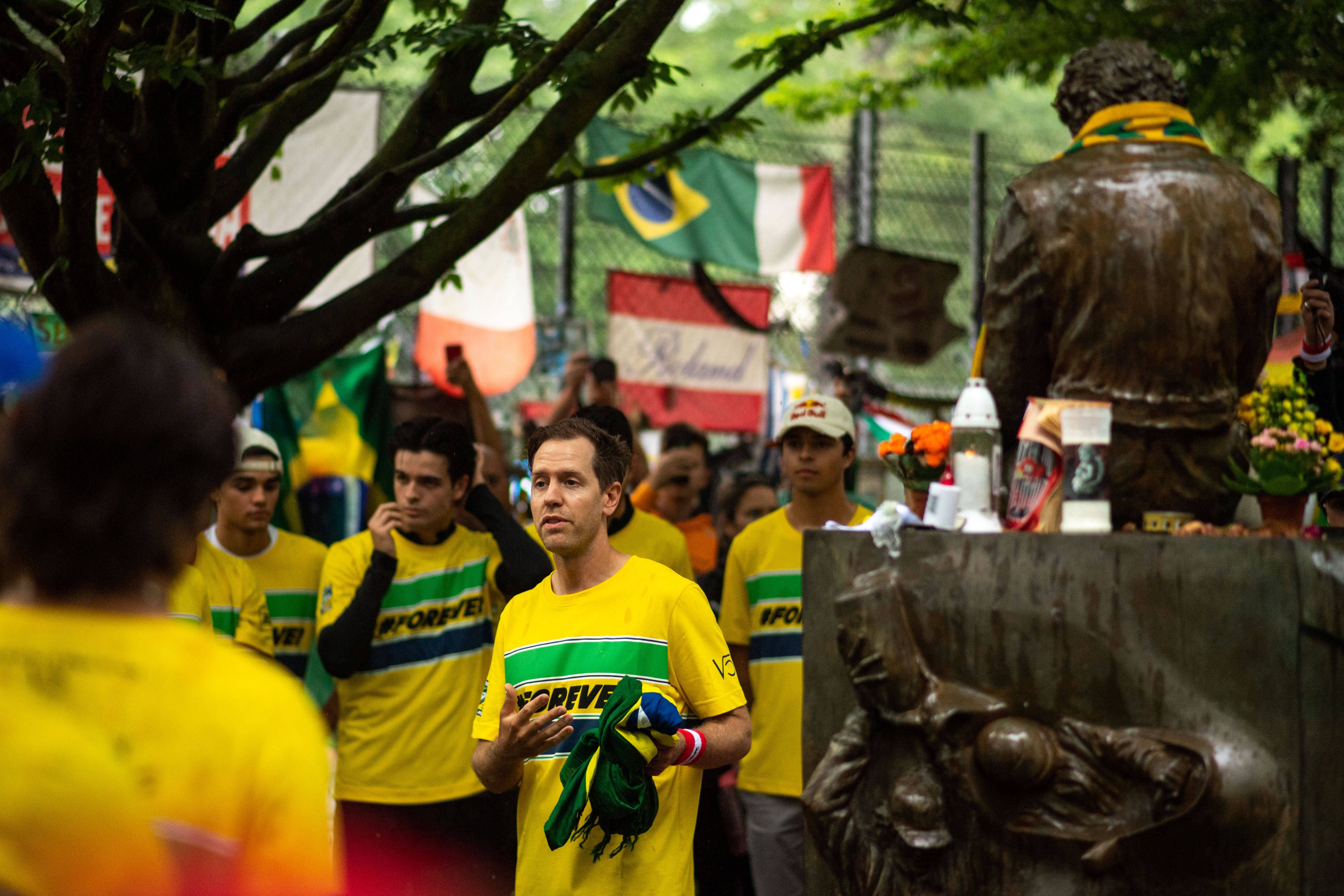 Vestindo também um fato amarelo, Vettel ainda levou para o carro as bandeiras do Brasil e a da Áustria, lembrando também Roland Ratzenberger - piloto que faleceu noutro acidente, na véspera de Senna.