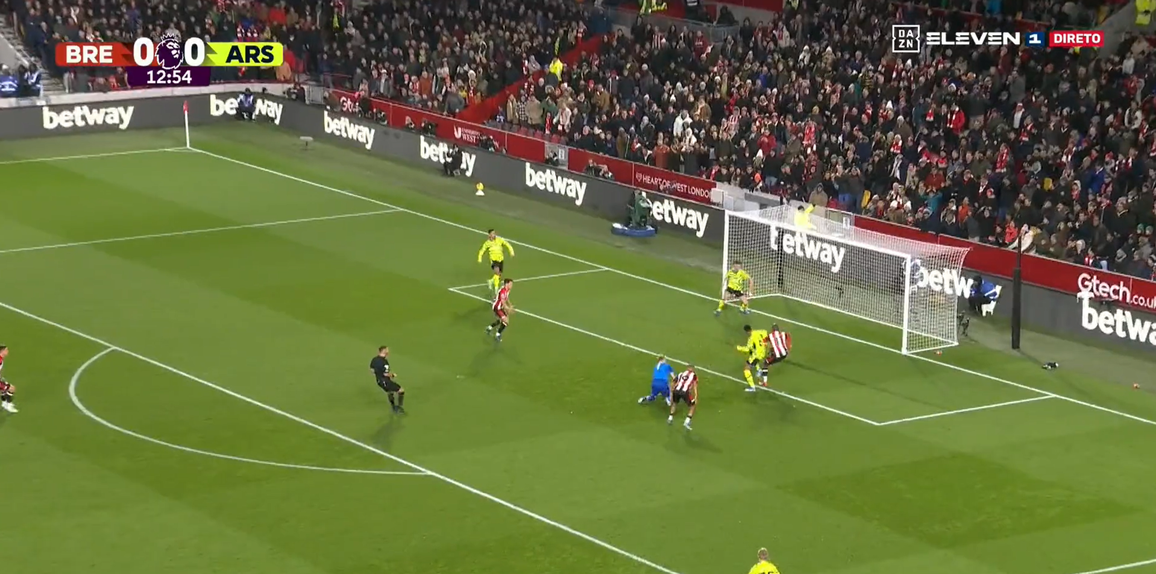 Por pouco que não deu em golo, mas o guarda-redes inglês ficou muito mal neste lance, numa altura em que compete pela titularidade com David Raya, que tem sido o escolhido por Mikel Arteta. Declan Rice acabou por ser o herói dos gunners, cortando a bola em cima da linha.