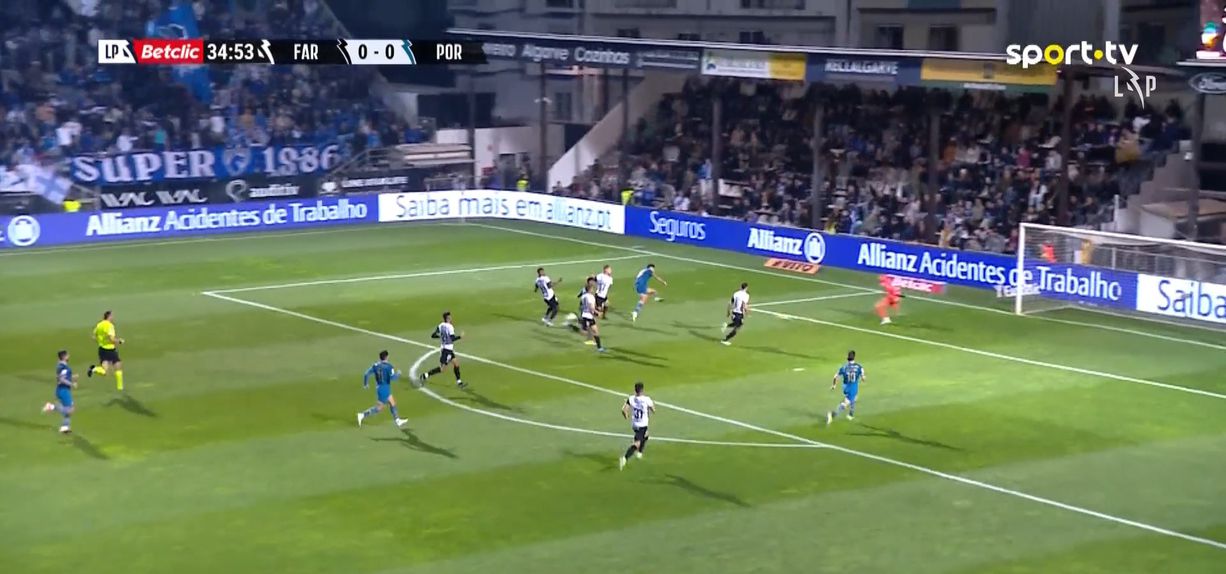 O FC Porto inaugurou o marcador frente ao Farense, minutos depois de Mattheus Oliveira ter falhado um penálti para a equipa da casa. Evanilson desmarcou-se e, de primeira dentro da área adversária, fuzilou a baliza para o primeiro golo da tarde.