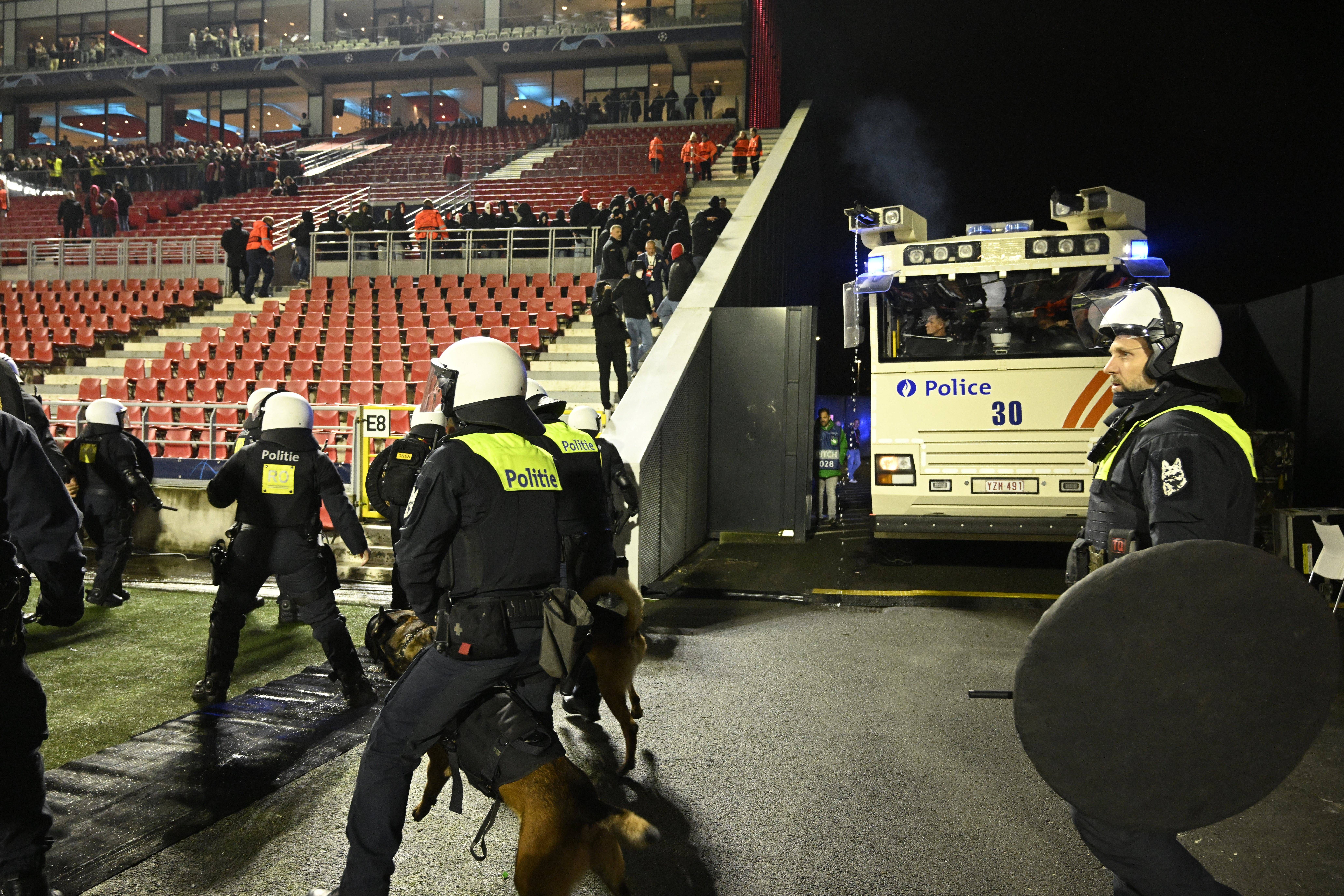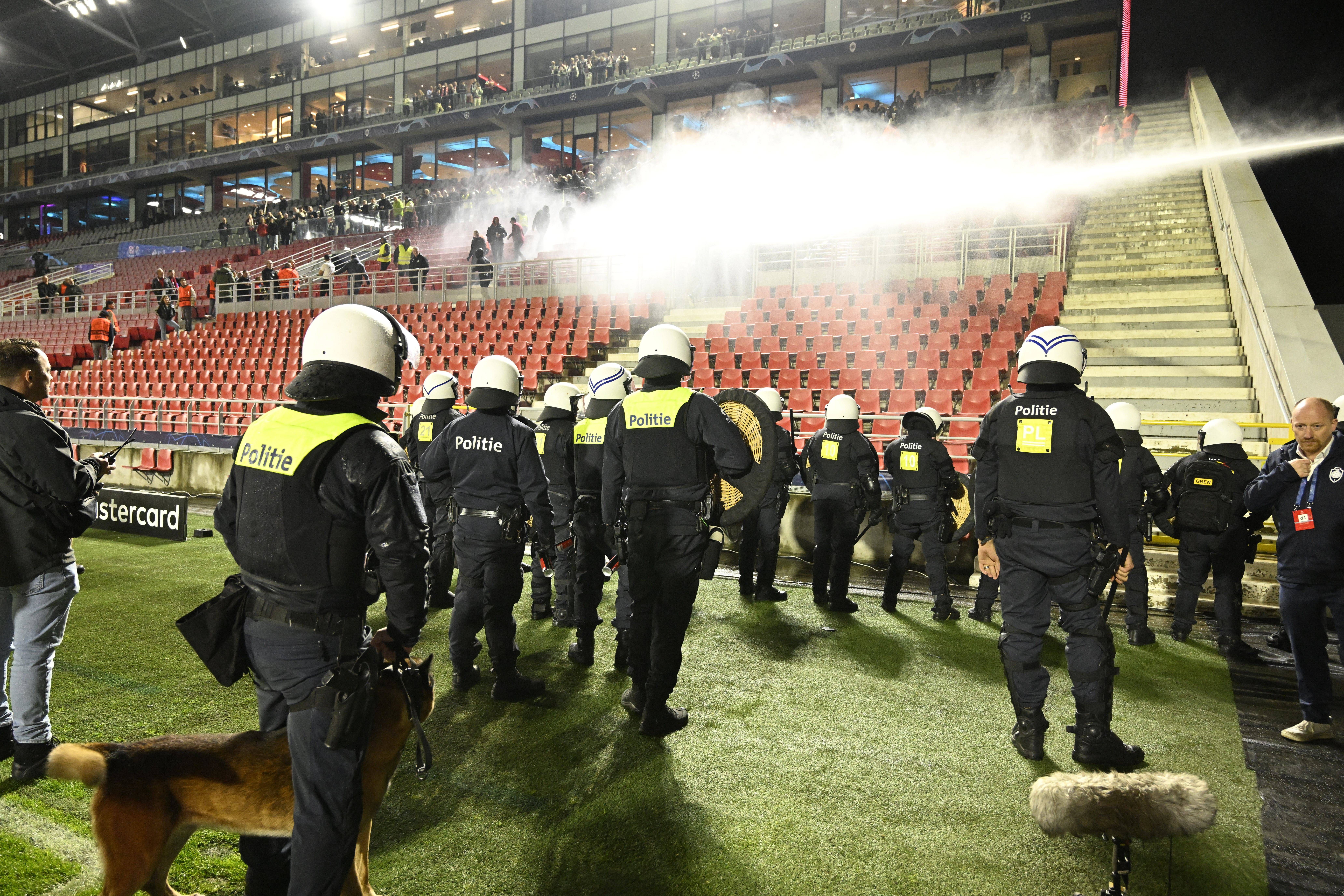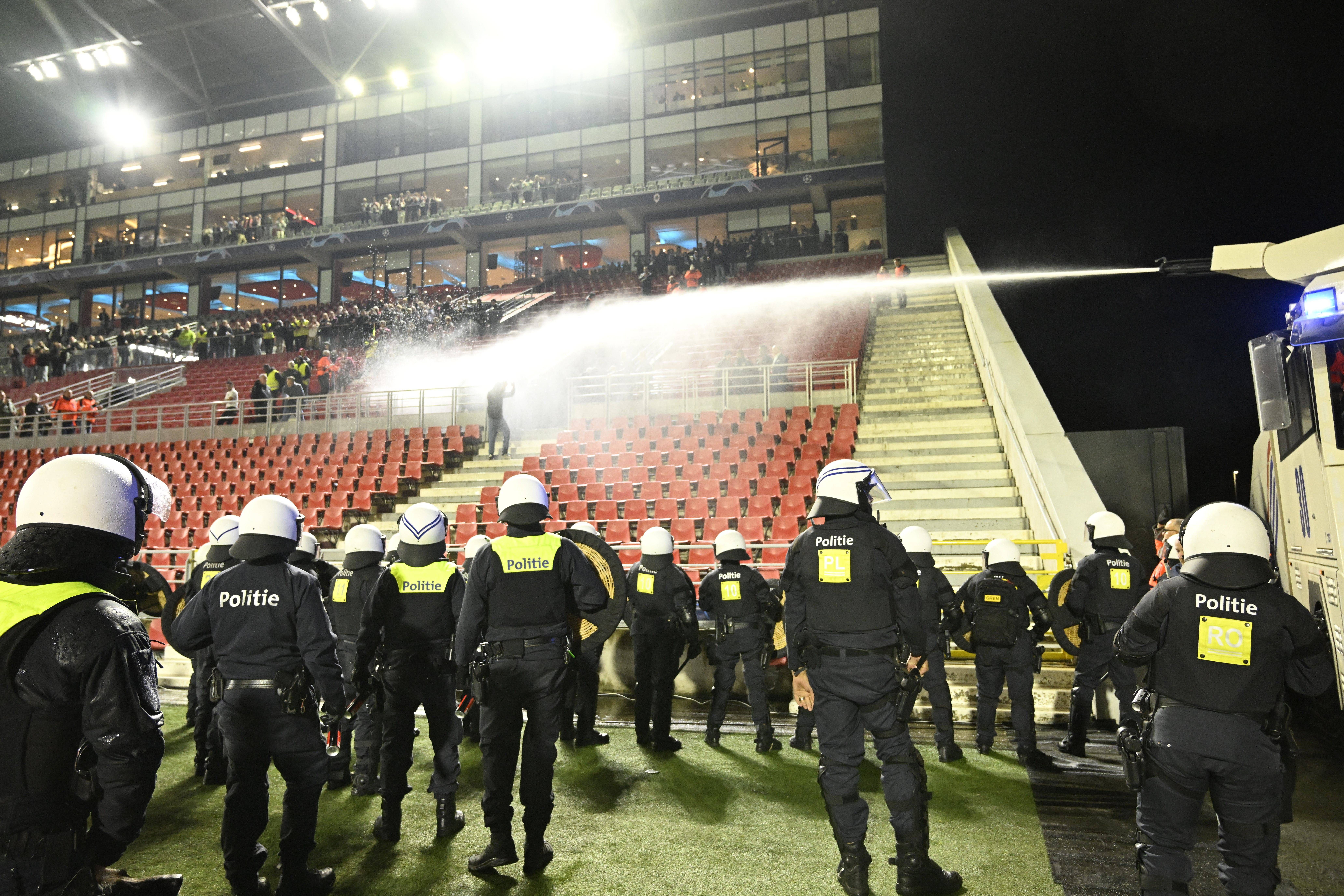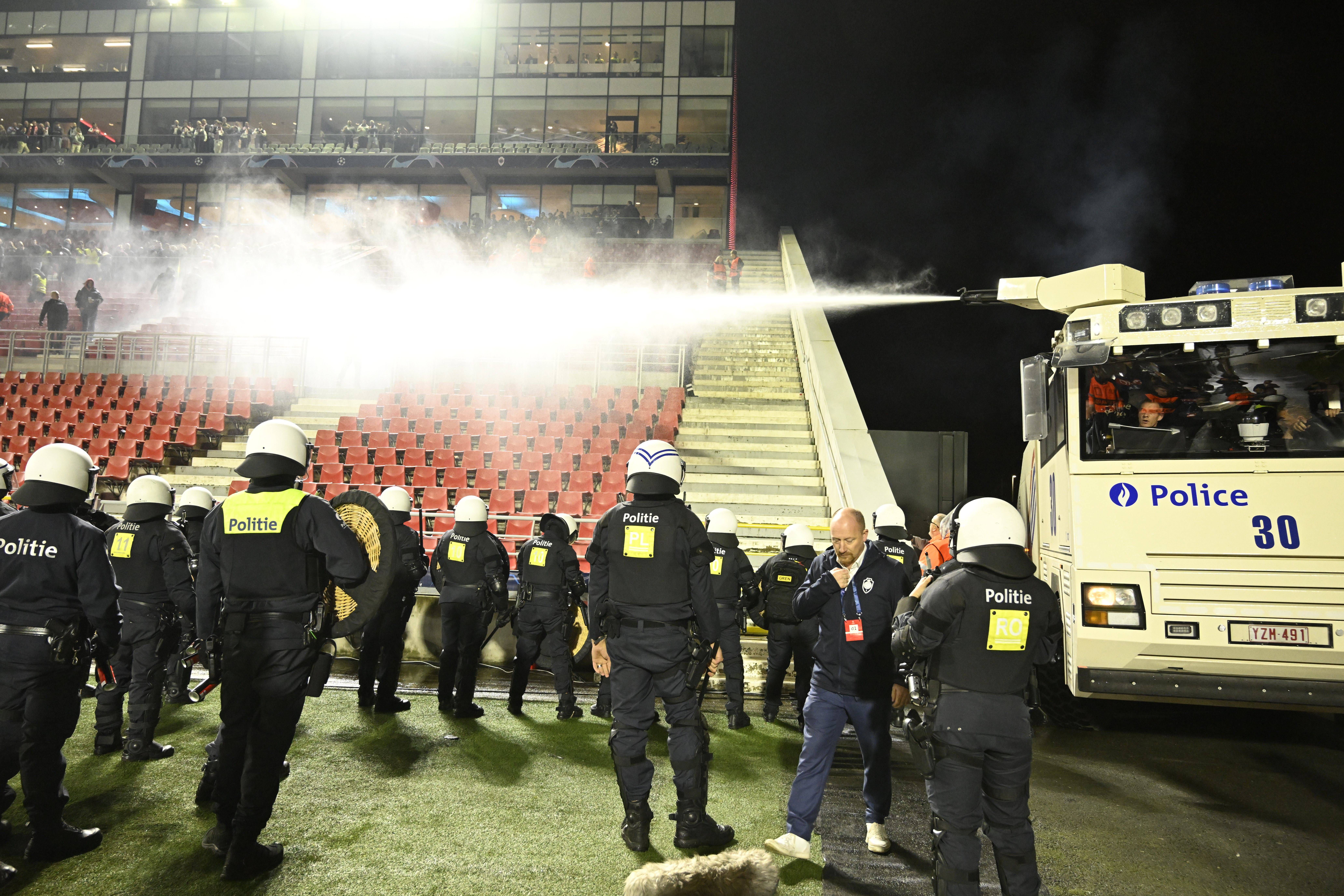 Dezenas de agentes invadiram o relvado para proteger os adeptos portistas e os adeptos belgas que quiseram armar-se em hooligans acabaram a levar enorme banho, porque a polícia belga não brinca em serviço e levou para dentro de campo um veículo com canhão de água... Levaram dois banhos na mesma noite...