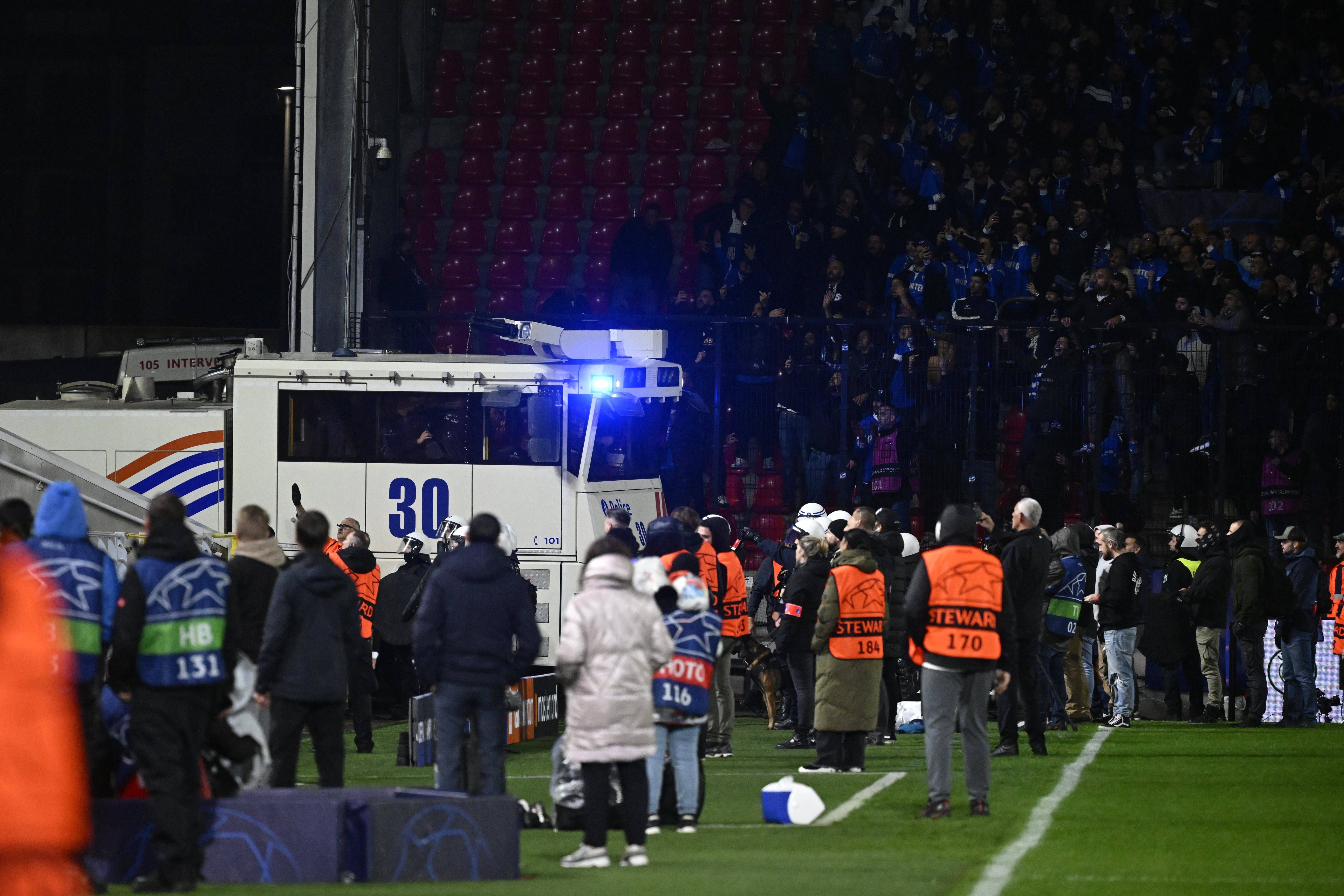 Polícia chamada ao interior do estádio para defender adeptos portistas de 'hooligans'. Canhão de água utilizado...