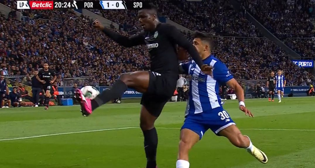 Jogadores e equipa técnica do FC Porto ficaram a pedir grande penalidade de Diomande sobre Evanilson, depois de um toque com o braço do defesa dos leões na cara do avançado dos dragões. Nuno Almeida e o VAR mandaram seguir.