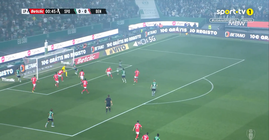 Pedro Gonçalves entrou na grande área e tentou cruzar para Gyokeres, mas um desvio da defesa dos encarnados fez com que a bola fosse ter com o moçambicano após um toque de Trubin e o ala do Sporting atirou para o fundo das redes, com a baliza praticamente aberta.