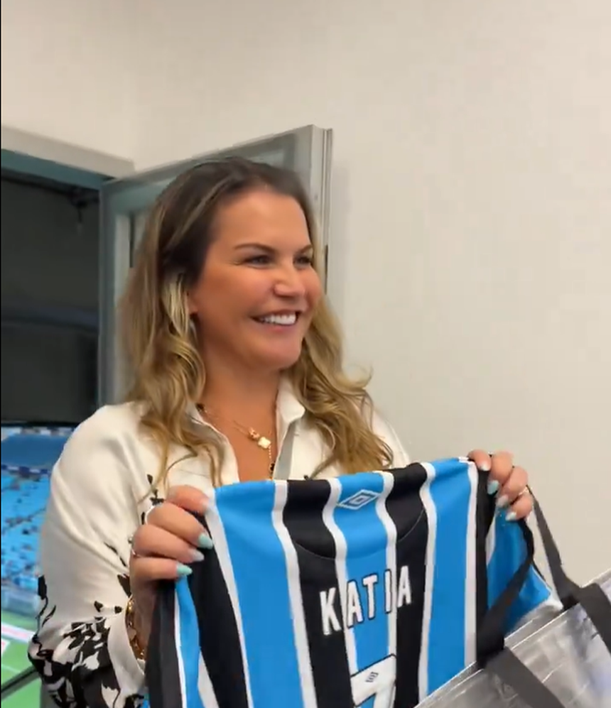 A vitória do Grêmio sobre o Caxias na meia-final do Campeonato Gaúcho desta madrugada teve uma convidada especial: Kátia Aveiro. A irmã de Cristiano Ronaldo, com o marido Alexandre Bertolucci, foi recebida pela diretoria do clube, que lhe ofereceu uma camisola personalizada com o seu nome, e outra com o nome do jogador do Al Nassr.