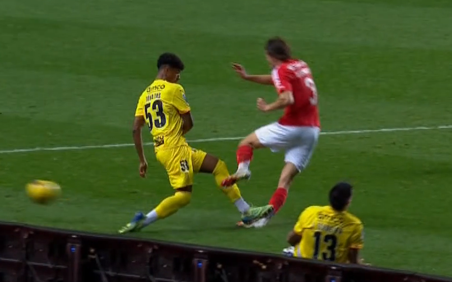 O jovem de 19 anos do SC Braga pisou o espanhol, que chegou primeiro à bola, e, com recurso ao VAR, Cláudio Pereira mostrou-se o cartão vermelho direito, ao minuto 78. Este era o seu segundo jogo pela equipa principal, depois de ter sido titular contra o 1.º Dezembro.