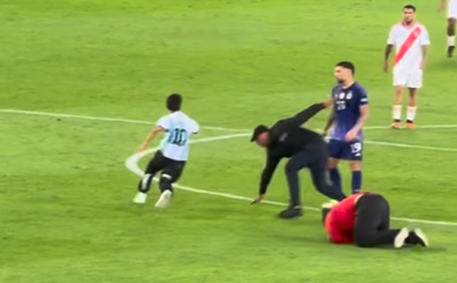 A criança, que tinha vestida a camisola 10 da Argentina, acabou por ser retirada de campo pelos seguranças.