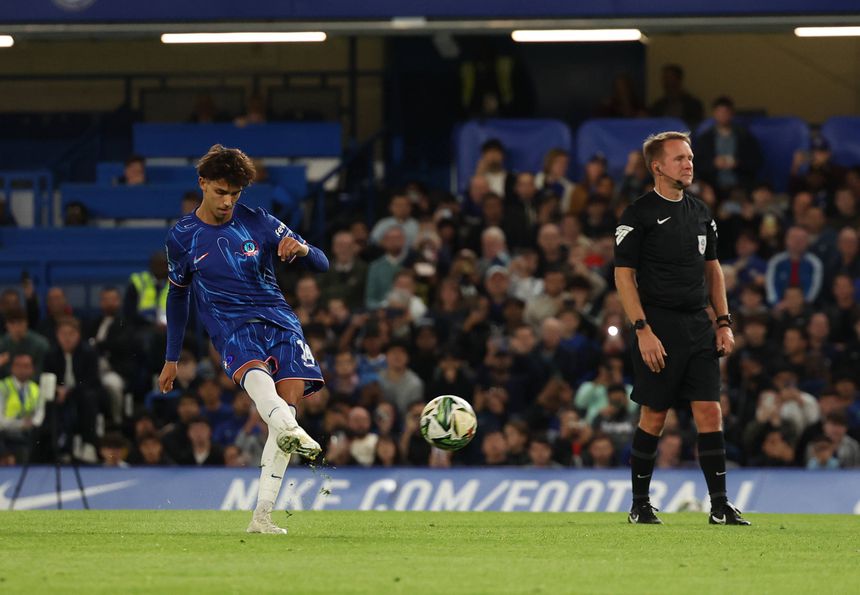 O momento em que João Félix converteu o livre direto, resultando no 3-0 para o Chelsea
