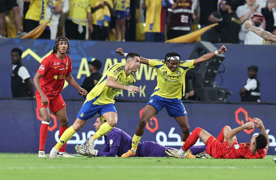 Cristiano Ronaldo festeja o primeiro do Al Nassr frente ao Al Qadsiyah (X/@SPL)