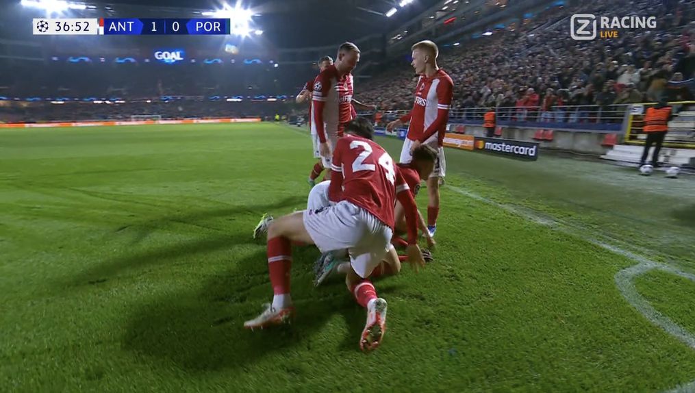 Erro na saída de bola de Alan Varela permitiu ao Antuérpia recuperá-la junto da grande área e, depois de um ressalto em David Carmo, é o nigeriano Yusuf a atirar fora do alcance de Diogo Costa, colocando os belgas na frente diante do FC Porto.