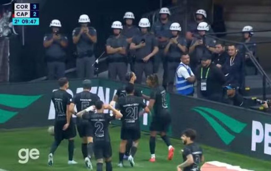 Memphis Depay estreou-se a marcar no Brasileirão, na vitória por 5-2 do Corinthians em casa sobre o Athlético Paranaense, e nem os agentes da polícia militar em serviço no jogo quiseram perder.