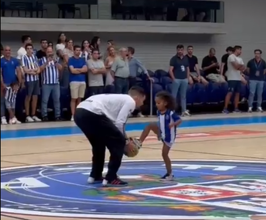 Alícia, filha do malogrado Alfredo Quintana, que defendeu a baliza dos dragões e da seleção nacional, entrou em campo e esteve a brincar com Gustavo Capdeville.