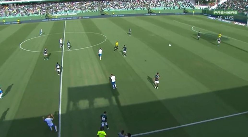 Defesa do Bahia marcou no terreno do Goiás... antes do meio-campo. É caso para dizer que... Gilberto Carlos voltou a atacar!