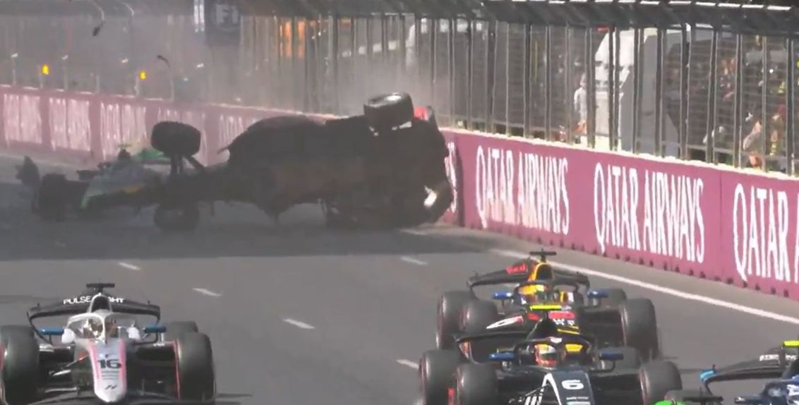A corrida de Formula 2 No Grande Prémio do Azerbaijão, em Baku, registou um dos acidentes mais impressionantes do ano. Kush Maini, que partiu em quinto lugar, não conseguiu ligar o carro no momento da partida e ficou parado no lugar, enquanto todos os que estavam atrás dele o ultrapassavam a alta velocidade para o tentar evitar.
